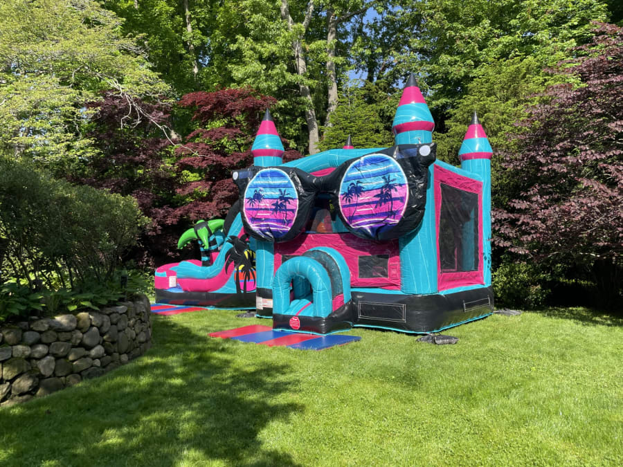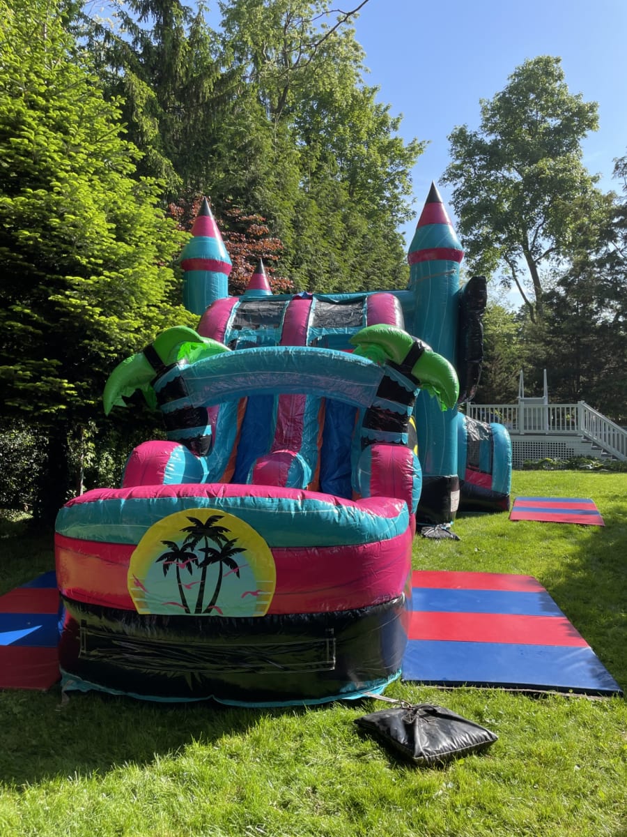 New for 2024!! Looking for a fun and exciting addition to your next party or event in Suffolk County, Patchogue, Medford, or the surrounding areas? Look no further than our South Beach Bounce House with Sunglasses and Palm Trees!